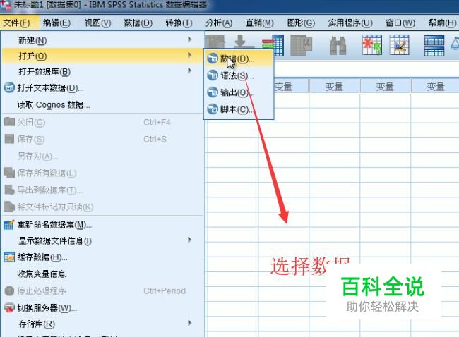 首先点击SPSS软件的顶部文件菜单,选择下拉菜单中的数据选项,如下图所示