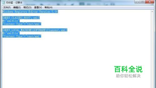 将下面的代码复制进记事本里面 Windows Registry Editor Version 5.00 [HKEY_CLASSES_ROOT\.xml] @="xmlfile" "Content Type"="text/xml" [HKEY_LOCAL_MACHINE\SOFTWARE\Classes\.xml] @="xmlfile" "Content Type"="text/xml"