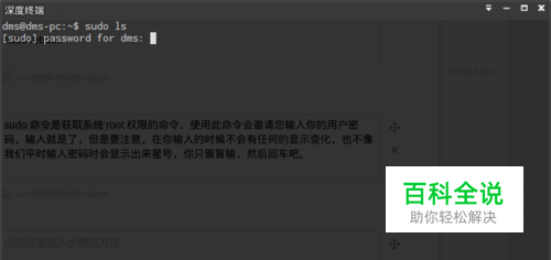 sudo 命令是获取系统 root 权限的命令,使用此命令会邀请您输入你的用户密码,输入就是了,但是要注意,在你输入的时候不会有任何的显示变化,也不像我们平时输入密码时会显示出来星号,你只管盲输,然后回车吧。 如下图,其实我已经输入完了密码