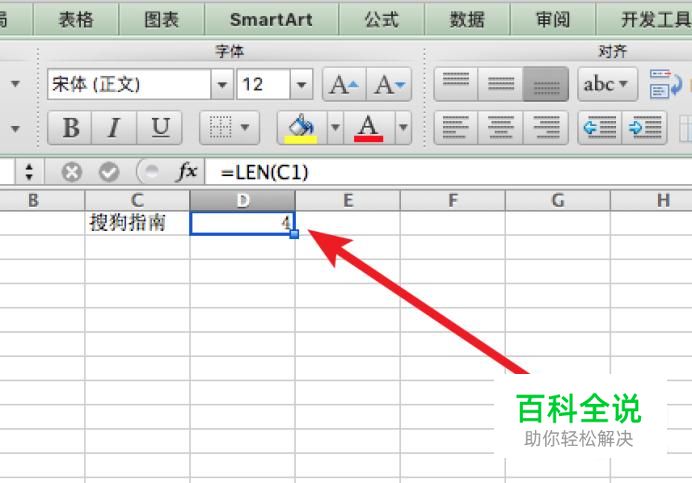 回车后,就会应用公式了,在单元格里就得到函数计算出来的值了,这个字符串的长度就是4.