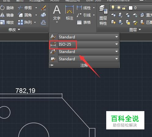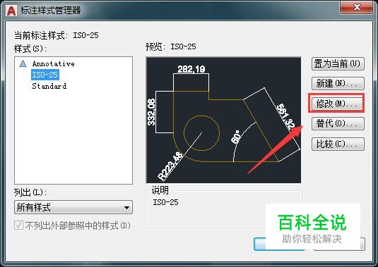 点击标注样式选项在弹出的对话框内找到修改选项,如图所示: