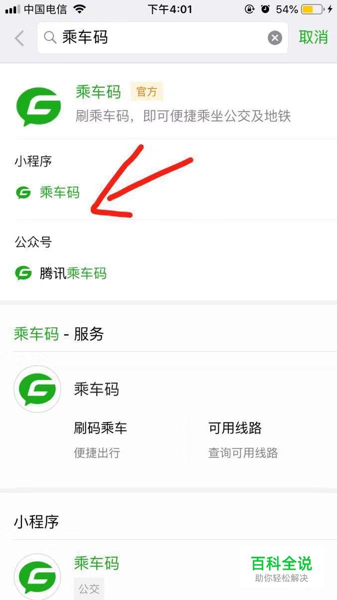 在微信搜索框中输入“乘车码”进入小程序。