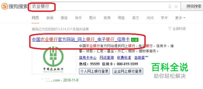 首先,我们需要打开浏览器,可以用搜狗搜索进入绿色认证的农行官网。