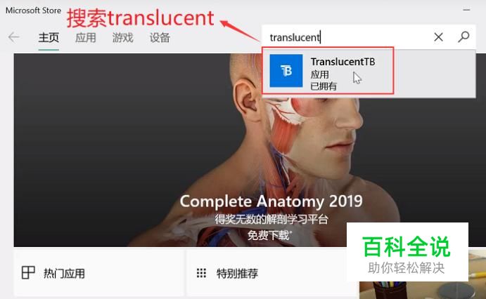 接下来在microsoft store商店中搜索translucent,这时会显示translucent应用,我们选择它,如下图所示