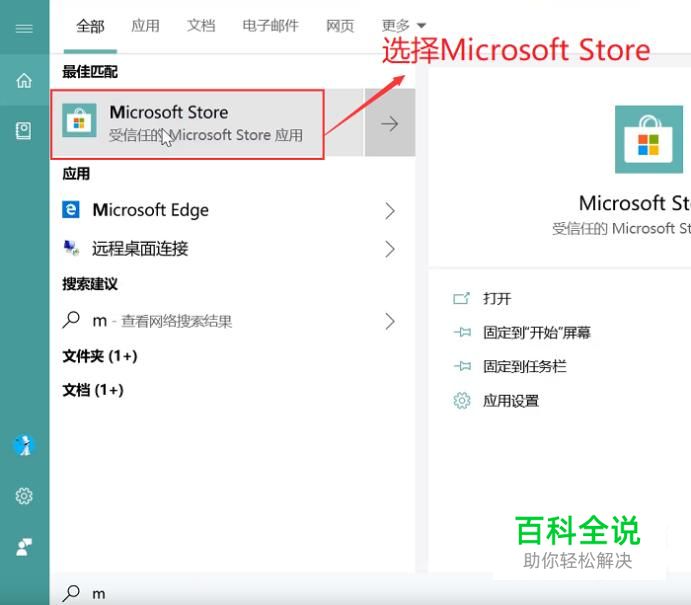 首先点击win10左下角的开始菜单,搜索microsoft store并点击,如下图所示