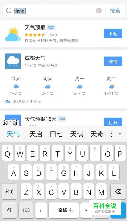 输入你想要查看的小程序关键字,这里以“天气”示例。 注意:不用点击搜索,输入文字“天气”即可。