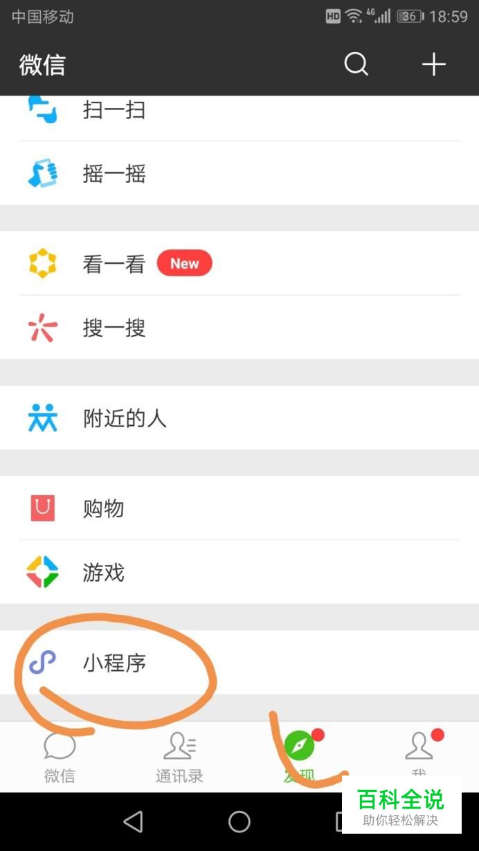 点击发现,界面拉至最下,可以看到“小程序”,我们点击小程序进入。