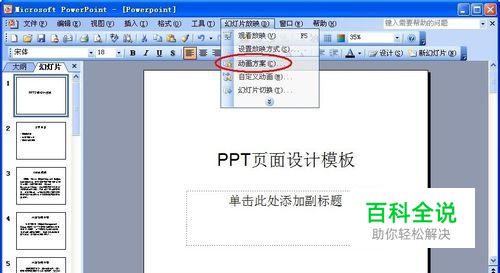 现则PPT中的【幻灯片放映】 再选择其中的【动画方案】