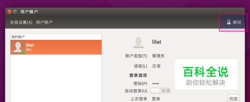 打开用户帐户设置窗口后,点击右上角的"解锁"按钮。