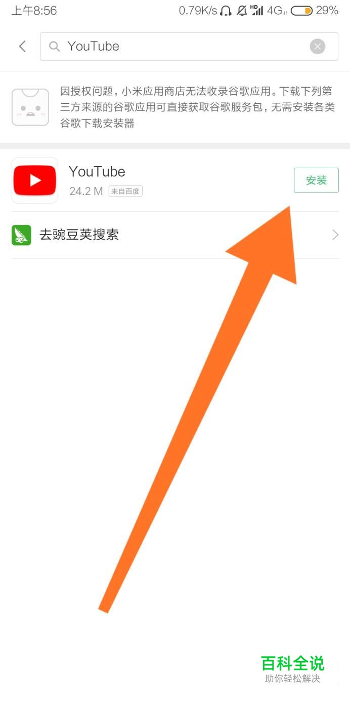 进入“应用商店”后,在搜索栏输入任意一款谷歌应用名称,在这里我们输入“YouTube”,然后点击搜索图标。