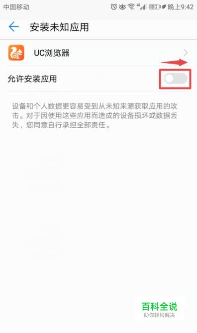弹出的界面,我们将允许安装应用的开关向右滑动打开,这样这个应用下载下来应用进行安装就可以正常安装了。