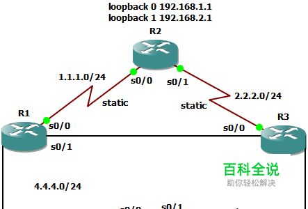 R2: interface Loopback0 ip address 192.168.1.1 255.255.255.0 ! interface Loopback1 ip address 192.168.2.1 255.255.255.0 ! interface Serial0/0 ip address 1.1.1.2 255.255.255.0 ! interface Serial0/1 ip address 2.2.2.1 255.255.255.0 ! ip classless ip route 3.3.3.0 255.255.255.0 2.2.2.2 ip route 3.3.3.0 255.255.255.0 1.1.1.1 2 ip route 4.4.4.0 255.255.255.0 1.1.1.1 ip route 4.4.4.0 255.255.255.0 2.2.2.2 2 ! !