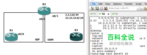 R1: interface Serial0/0 ip address 1.1.1.1 255.255.255.0 ! interface Serial0/1 ip address 4.4.4.2 255.255.255.0 ! router ospf 1 log-adjacency-changes redistribute static subnets route-map cisco !--重发布静态地址,使用route-map network 4.4.4.0 0.0.0.255 area 0 ! ip classless ip route 192.168.1.0 255.255.255.0 1.1.1.2 ip route 192.168.2.0 255.255.255.0 1.1.1.2 ! access-list 1 permit 192.168.1.0 access-list 2 permit 192.168.2.0 no cdp log mismatch duplex ! route-map cisco permit 10 !--配置route-map name=cisco 优先级为10 ,越小越高 match ip address 1 !--匹配access-list set metric 1 !--设置metric 值 ! route-map cisco permit 20 !--此条的意思是设置第二条 ,优先级为20 match ip address 2 !--匹配access-list set metric 2 !--设置metric 值