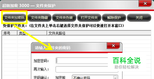 点击文件夹加密码,选择需要加密码的文件夹,然后输入加密密码,点击确定即可。在文件夹保护窗口就可以看到加密记录了。文件夹加密码后,只有先输入正确密码才能打开使用。如果想要解除密码,只需选中文件夹,单击窗口上方的解除保护按钮就可以了。