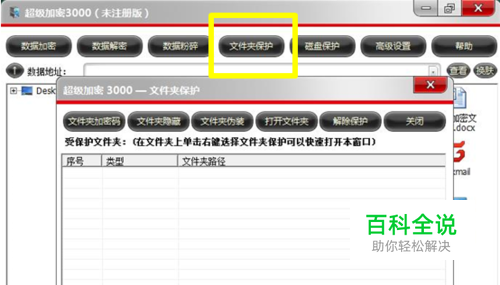 点击文件夹隐藏,选择需要隐藏的文件夹,然后点击确定(这种加密方法不需要输入密码)。这样,在你的电脑上就找不到那个文件夹了。如需解除隐藏,方法同上,只需选中文件夹,单击窗口上方的解除保护即可。