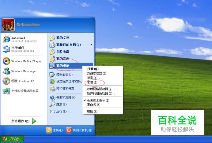 启动Windows XP操作系统,如图所示。唤出任务栏开始菜单,鼠标右击"我的电脑"图标选择"管理"项。