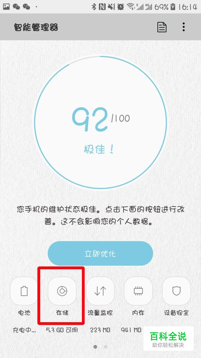 如果我们想查看手机运行内存还有多少,先返回到智能管理器页面,再点击内存