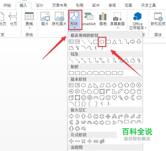 打开word之后我们在插入里找到形状选项,点击该选项在其内找到椭圆形选项,如图所示: