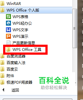 如下图,在启动程序--所有程序中,找到 WPS Office个人版文件夹工具,点击打开。找到其中的 “ WPS Office工具”,然后点击打开。