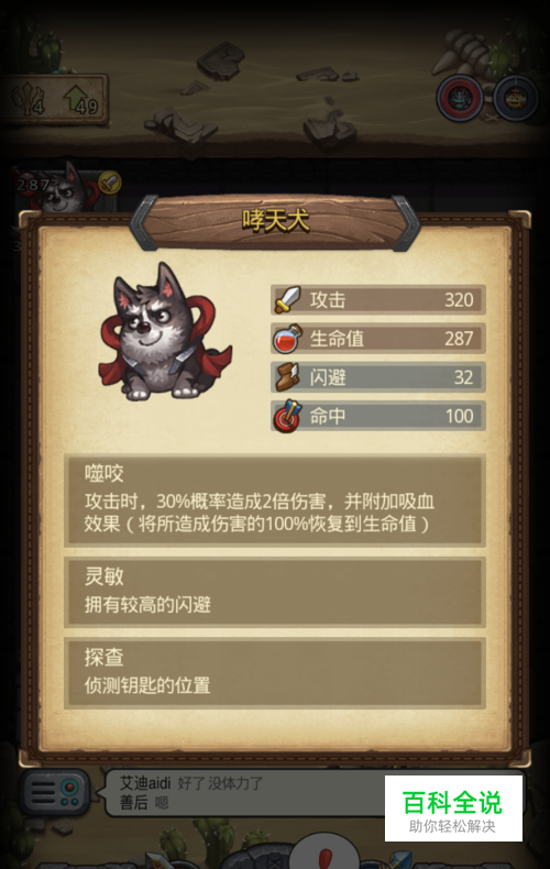 前39层,进入图后,小编不推荐大家在1层招狗,因为我们前期1无物品,2无技能,只能靠翻格子获取狼人药剂的攻击加成,所以大家就先手动点到第五层,然后再使用狼人药剂,这样可以比第一层增加的攻击高30-50点左右.如图可以看到小编第五层招出来的狗的属性。