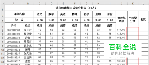 求得第一位同学的平均学分绩后,选定K5单元格,移动光标至K5单元格右下角,待空心十字变为实心十字时,按下鼠标左键,向下拖动鼠标至K14单元格,即可求得所有同学的平均学分绩。