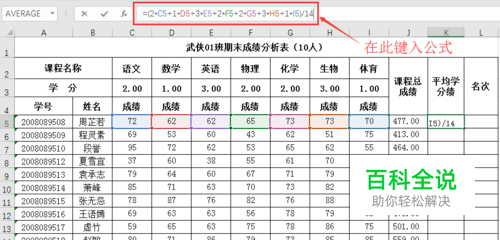 选定K5单元格,按照平均学分绩计算公式,直接在公式编辑栏(或单元格)中直接键入“=(2*C5+1*D5+3*E5+2*F5+2*G5+3*H5+1*I5)/14”,然后按下Enter键,可在K5中求得该同学的平均学分绩。