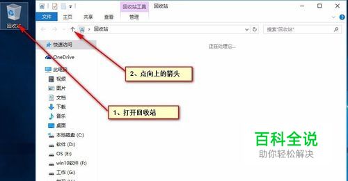 打开桌面的回收站,在回收站左侧有个向上↑箭头,点一下这个箭头。