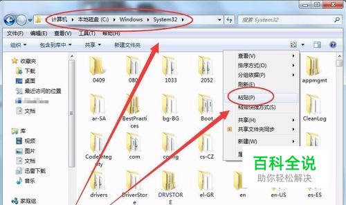 System32文件夹中,右击粘贴文件。