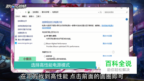 方法一:更改电源模式。打开电源选项,看到“选择或自定义电源计划”,在下方选择“高性能”电源模式。