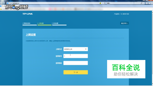 然后在上网设置页面中选择宽带拨号的上网方式,输入宽带拨号,上网账号和密码,点击下一步