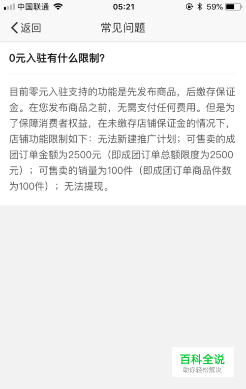0元入驻有什么限制? 目前零元入驻支持的功能是先发布商品,后缴存保证金。在您发布商品之前,无需支付任何费用。但是为了保障消费者权益,在未缴存店铺保证金的情况下,店铺功能限制如下:无法新建推广计划;可售卖的成团订单金额为2500元(即成团订单总额限度为2500元);可售卖的销量为100件(即成团订单商品件数为100件);无法提现。