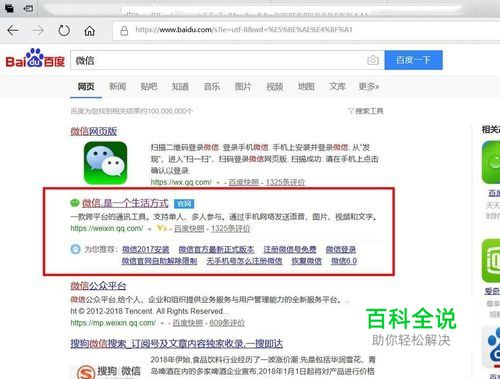 打开浏览器,输入“微信”搜索,打开红框选中的这一个。