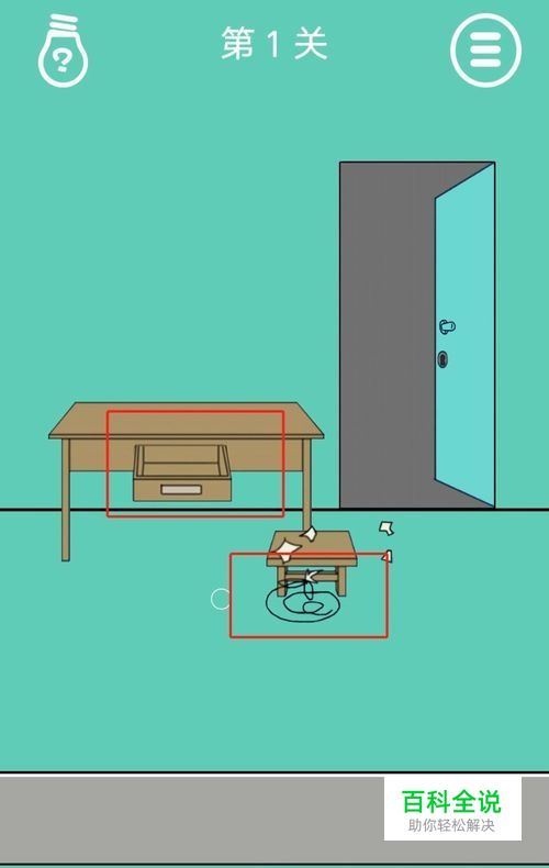 爸爸把我锁在家里了 第一关过关攻略: 打开抽屉,取出刀,用刀割断绳子,点击凳子上取出钥匙,用钥匙开门
