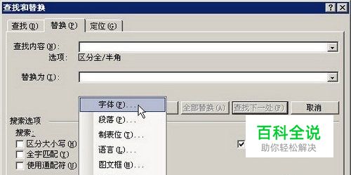 第2步,单击“查找内容”编辑框使其保持为空,然后单击“高级”按钮,在“替换”区域单击“格式”按钮,并在打开的下拉菜单中选择“字体”命令,如图2012040302所示。 图2012040302 选择“字体”命令