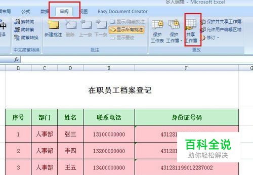首先让我们来启动Exce的2007版本。启动后,在其中创建一个表格。 选择“审阅”菜单(在老版本的Excel中对应的是“工具”菜单),然后点击菜单下方的“共享工作簿”按钮,弹出用于设置共享工作簿的对话框。