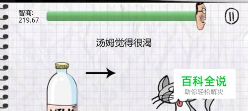 在第五关第二个测试中,汤姆猫觉得很口渴,想喝牛奶,按上图箭头方向所示,左右晃动手机就可以把牛奶瓶打碎,汤姆猫也就可以喝到牛奶了。