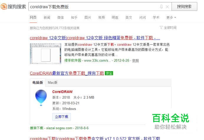 在搜索框中填入“CorelDRAW下载”,点击“搜索”,进入搜索结果页面,如图所示。