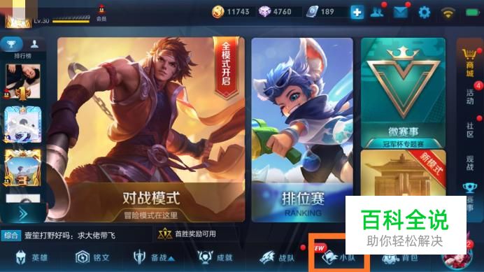王者荣耀的小队是五人小队,也就是说只有五个人一起才能参加月赛,首先在大厅点击‘小队‘。