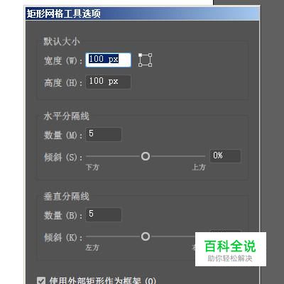 鼠标移到画板这里,点击一下,弹出设置面板。然后,按照表格的要求,对矩形网格的各个选项进行设置。在这里就按默认的就好啦。设置好后,点击确定。即时,在画板上显示出一个矩形网格。