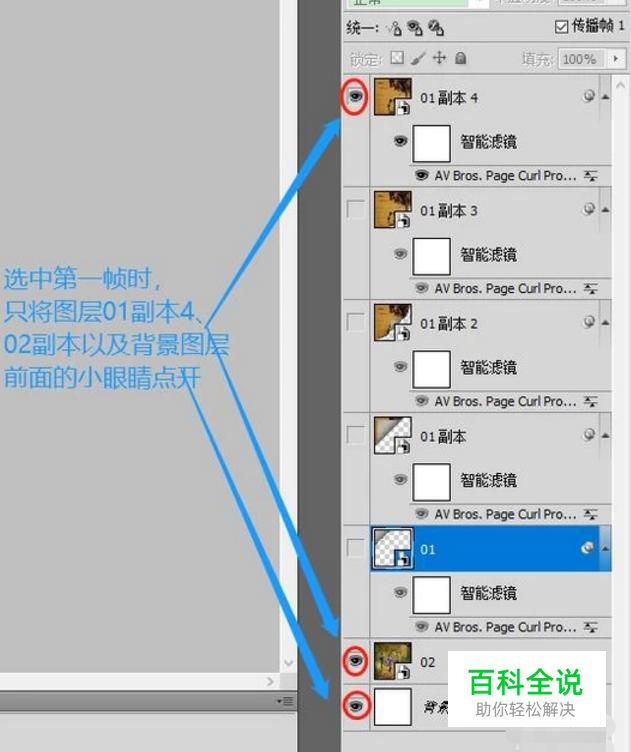 接着在左下角复制一帧,选择第二帧以后,将右侧的“01副本3”“02”以及"背景"这三个图层前面的小眼睛打开;