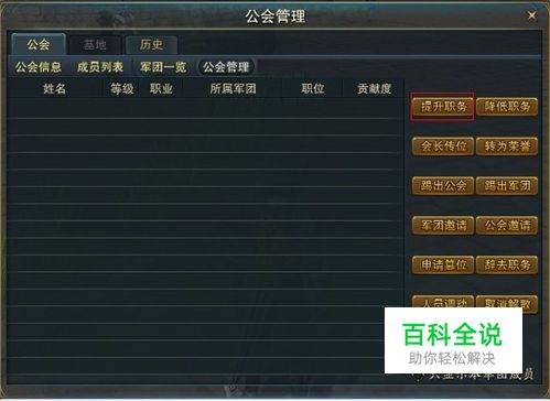 公会人员调动 1) 公会成员分为军团成员、荣誉成员和预备成员。刚加入的公会成员属于预备会员 2)会长和军团长可以通过“公会管理—人员调动”进行调整。 3)1级公会只有1个军团,当升为2级公会时就自动扩建为2个军团,这时会长可以任命2个军团的军团长为副会长。 4)任命军团长和副会长可使用“公会管理-提升职务”功能实现,此功能还可以将预备会员提升为会员。
