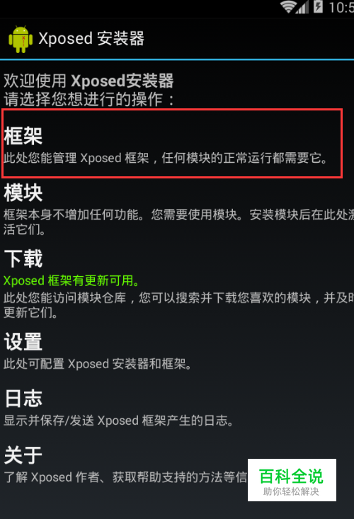 手机先root,然后安装Xpodes框架,安装好后打开,点击框架,这时会提示授权,允许授权,然后点击安装更新,重启手机。