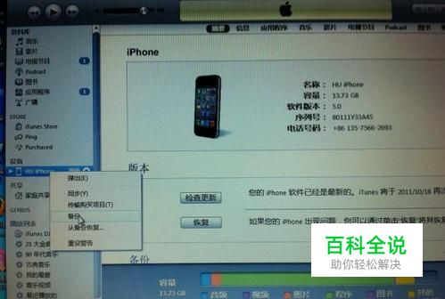 运行itunes 10.5 ,使用USB数据线连接iphone至电脑。在itunes界面左侧选择你的设备,然后右键单击设备名称,在弹出的菜单中选择“备份” 。等待备份完成,这样可以等后面的越狱完成后无损恢复你的设置和数据。