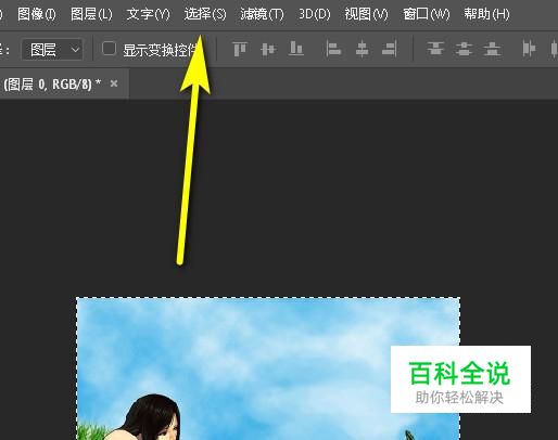 鼠标移到菜单栏的“选择”这里。点击一下,弹出下拉菜单,再点:变换选区