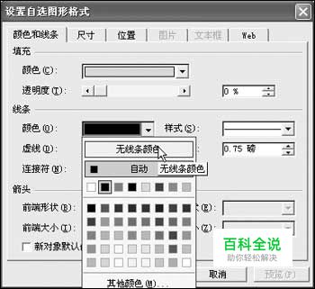 启动PowerPoint XP,新建一个幻灯片,点击“绘图”工具栏上“矩形”工具,在当前幻灯片上画一个大的矩形(如果看不到“绘图”工具栏,请点击菜单命令[查看]→[工具栏]→[绘图])。选中这个矩形框,双击打开“设置自选图形格式”对话框。点击“颜色和线条”选项卡,在“线条”项目中点击“颜色”下拉按钮,在弹出的颜色设置列表中,点击“无线条颜色”,清除此矩形的边框颜色(如图1)。 图1 设置线条