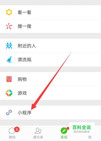 打开微信,进入发现页面,点击“小程序”,如图所示。