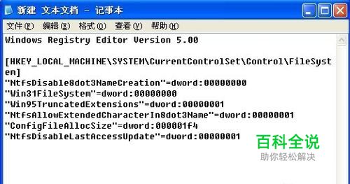 将下列代码拷入文本文档中。 Windows Registry Editor Version 5.00[HKEY_LOCAL_MACHINE\SYSTEM\CurrentControlSet\Control\FileSystem] "NtfsDisable8dot3NameCreation"=dword:00000000 "Win31FileSystem"=dword:00000000 "Win95TruncatedExtensions"=dword:00000001 "NtfsAllowExtendedCharacterIn8dot3Name"=dword:00000001 "ConfigFileAllocSize"=dword:000001f4 "NtfsDisableLastAccessUpdate"=dword:00000001