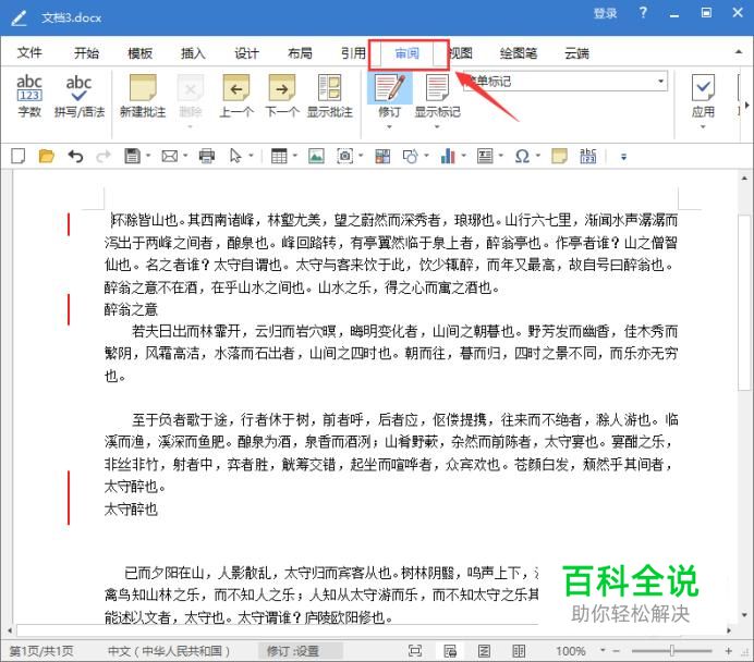 点击菜单栏的“审阅”按钮。