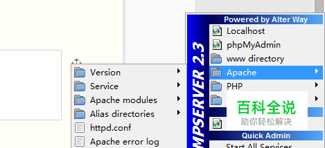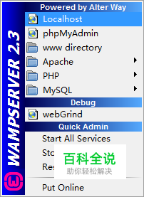 点击任务栏右侧的wampserver图标,之后会出现如下图示的菜单。