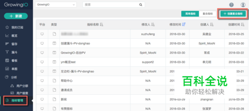 圈选了数据之后,可以直接利用简单指标进行分析,或者通过【创建复合指标】来将各种简单指标加权组合, 来更综合地衡量业务运营情况。 在左侧菜单的【指标管理】中,点击右上角的【创建复合指标】按钮。